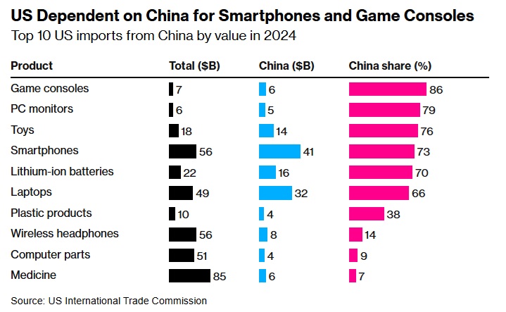 彭博社对美国国际贸易委员会数据的分析显示,某些行业的依赖程度甚至更高,美国进口的折叠伞、保温瓶、人造花、LED灯和木衣架等90%以上的产品都来自中国。