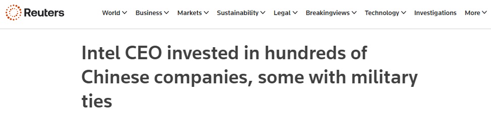中美突传大消息!路透:英特尔CEO投资数百家中企 至少八家与中国军方有关