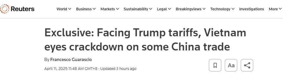 FX168财经报社(亚太)讯 英国路透社周五(4月11日)发布独家报道称,—据一位知情人士透露以及路透社看到的一份政府文件,为了避免遭受美国征收惩罚性关税,越南准备打击经其领土运往美国的中国商品,并将加强对敏感产品输华的管控。