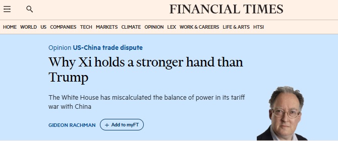 FX168财经报社(亚太)讯 英国《金融时报》专栏作家Gideon Rachman周一(4月14日)撰文称,相比美国总统特朗普(Donald Trump),中国国家主席习近平更加强势。白宫错误估计了与中国关税战中的力量平衡。