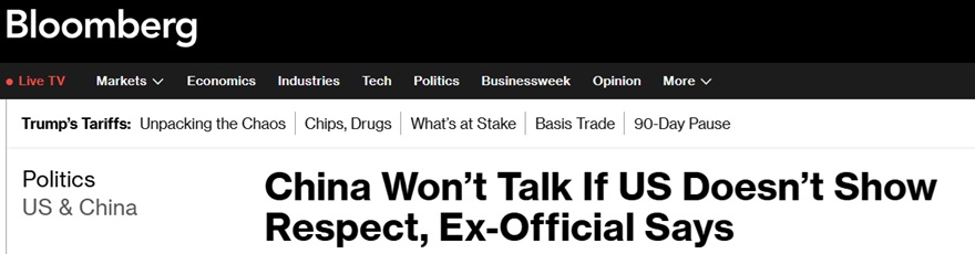 FX168财经报社(亚太)讯 美国彭博社当地时间周二(4月15日)发布独家报道称,一位前中国高级经济官员表示,只有美国领导人对北京方面表现出尊重,中国才会与美国进行谈判。