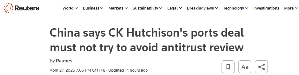 据中国官媒人民网报道,4月27日,国家市场监督管理总局发布消息称,长和港口交易各方不得采取任何方式规避反垄断审查。
