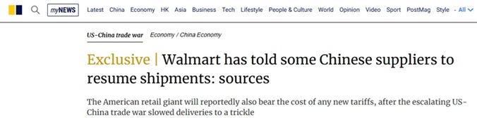 据《南华早报》获悉,中国江苏省和浙江省的部分制造商已接到沃尔玛等美国主要零售商的通知,要求其近日恢复发货。江苏省和浙江省是受中美贸易战重创的出口大省。