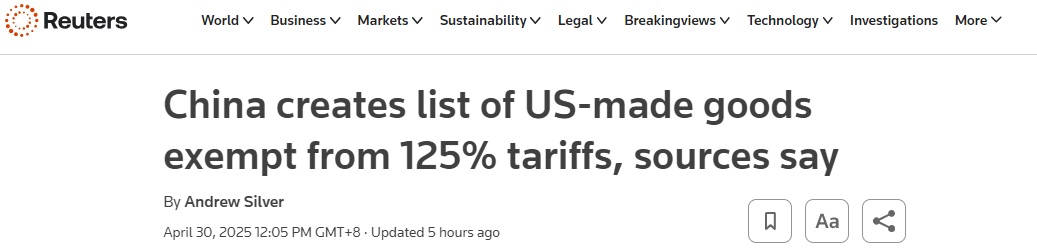FX168财经报社(亚太)讯 英国路透社周四(5月1日)报道称,中国近期已拟定一份美国进口商品的“白名单”,列出可免征最高达125%关税的项目。