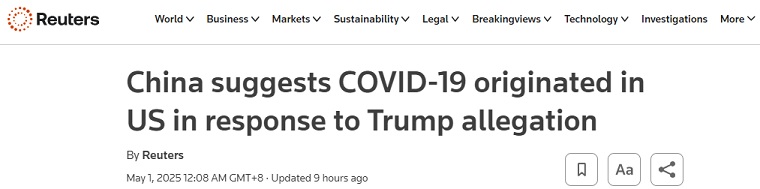 英国路透社称,在美国总统特朗普(Donald Trump)的政府将病毒归咎于中国实验室泄漏之后,中国在周三发布的疫情应对白皮书中重申了新冠病毒可能起源于美国的观点。