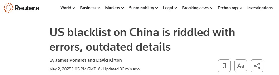 FX168财经报社(亚太)讯 英国路透社周五(5月1日)最新报道称,在美国对中国的“黑名单”中,充斥着错误和过时的细节。