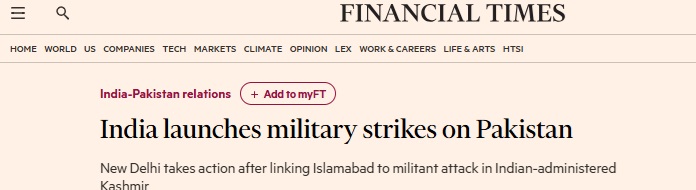 FX168财经报社(亚太)讯 英国《金融时报》周三(5月7日)报道称,印度对巴基斯坦境内的9个地点发动空袭,使这两个拥有核武器的邻国陷入公开的军事冲突,原因是上月在印控克什米尔地区,武装分子对游客发动了致命袭击。