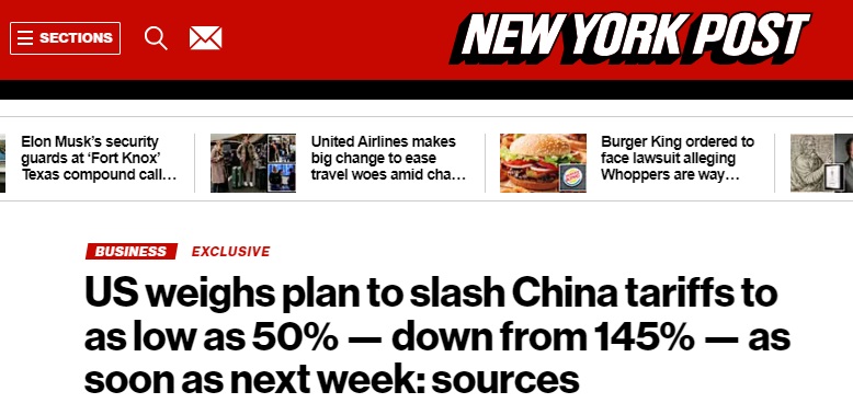 据《纽约邮报》获悉,在中美两国高级官员前往瑞士进行高层贸易谈判之际,特朗普政府正在考虑一项计划,将对中国进口商品征收的145%关税削减一半以上,最早将于下周生效。