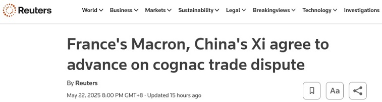 马克龙还写道:“我们同意加快推进法国干邑输华,这对法国干邑业者来说是必要的。”