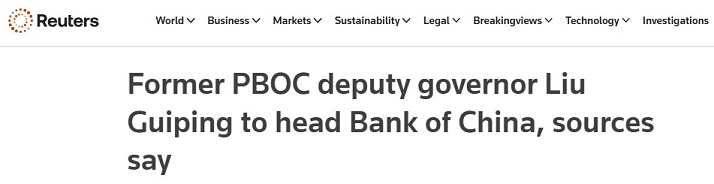 FX168财经报社(亚太)讯 英国路透社周四(5月22日)报道称,两位知情人士称,中国将任命金融界资深人士刘桂平为中国银行董事长。该行是中国第四大国有银行。