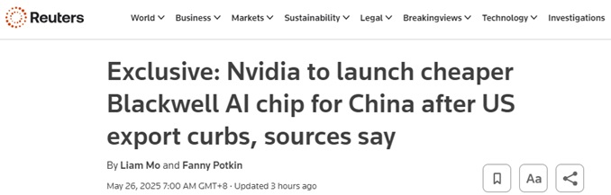 FX168财经报社(亚太)讯 英国路透社周一(5月26日)发布独家报道称,知情人士透露,英伟达(Nvidia)将为中国市场推出一款基于Blackwell架构的人工智能(AI)芯片,其价格将远低于近期限售的H20芯片,并计划最早于6月开始量产。
