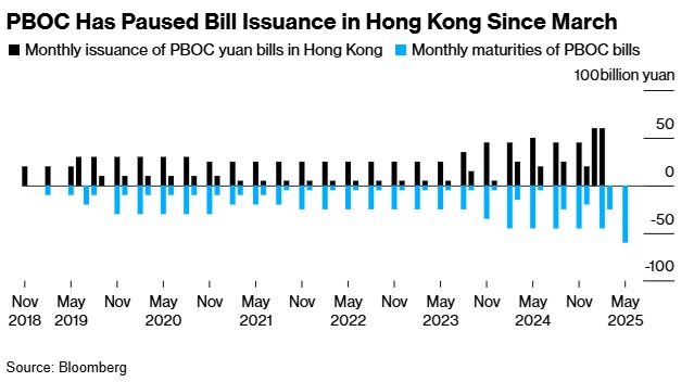 中国人民银行避免在香港发行票据。彭博社的计算显示,截至5月份的三个月内,到期票据向市场释放了850亿元人民币(约合118亿美元)的资金。这有助于将人民币一个月融资成本保持在1.7%左右,而1月份中国人民银行额外发行票据以挤压人民币空头时,融资成本曾高达4.5%。