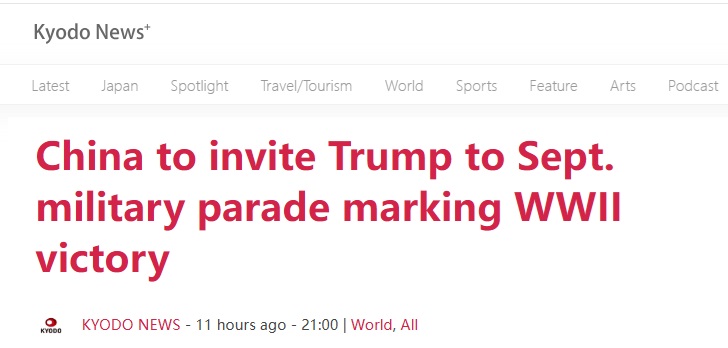 FX168财经报社(亚太)讯 日本共同社周日(6月29日)发布独家报道称,知情人士周日表示,中国计划邀请美国总统特朗普(Donald Trump)参加定于9月3日在北京天安门广场举行的纪念二战结束80周年阅兵式。