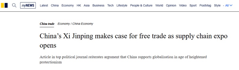 该文章发布于第三届中国国际供应链促进博览会开幕当天,《南华早报》称,这一时机似乎是经过深思熟虑的。