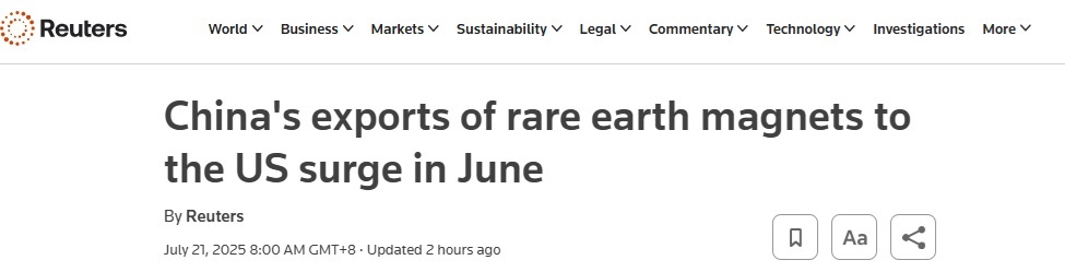 FX168财经报社(亚太)讯 英国路透社周一(7月21日)报道称,中国6月对美国的稀土磁铁出口量较5月份暴增逾6倍,显示关键稀土矿产贸易在中国美达成协议后正急剧回升。
