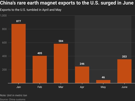中美重大信号!中国6月对美稀土磁铁出口暴增660% 稀土贸易正急剧回升