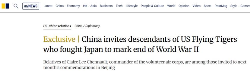 FX168财经报社(亚太)讯 香港《南华早报》周四(8月7日)最新报道称,据知情人士透露,中国已邀请美国飞虎队成员后裔下个月前往北京,出席抗战纪念活动。