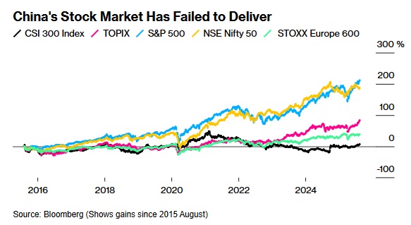 今年,中国股市涨势的局限性再次显现。尽管人工智能领域乐观情绪高涨,但沪深300指数的涨幅却不足7%,落后于美国和欧洲的基准指数。