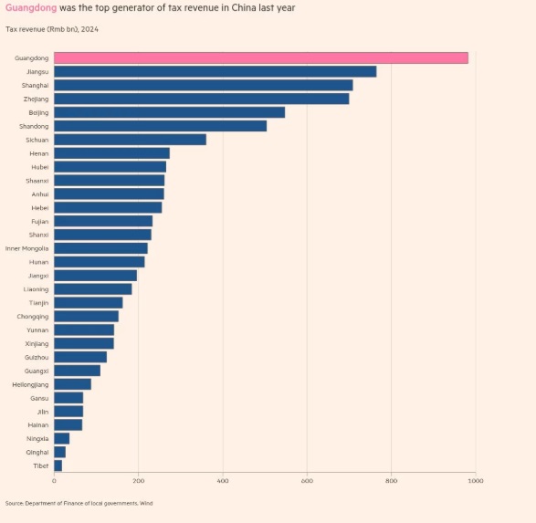 广东省对中央政府的税收贡献超过其他任何地区。近年来,全国经济低迷,北京方面已将更大比例的税收用于刺激贫困地区的经济增长。