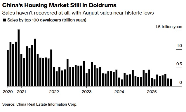 房地产市场持续低迷,8月份前100家最大开发商的房屋销售额较去年同期下降近18%,此前7月份为下降24%。