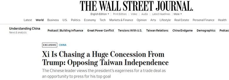 FX168财经报社(亚太)讯 美国《华尔街日报》周日(9月28日)发布独家报道称,中国国家主席习近平要求美国总统特朗普(Donald Trump)做出重大让步:即让特朗普表态反对“台独”。中国领导人将特朗普渴望达成贸易协议视为推动其最高目标的机会。
