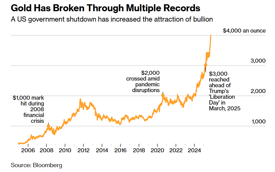 最近通胀上升和利率下降的前景也带来提振。本周,对政府债务上升的担忧,以及随后华盛顿的政治动荡,最终推动金价突破4,000美元。随着从日本到英国的投资者接受所谓的“贬值交易”,从法定货币转向贵金属或比特币等资产,白银也从中受益,逼近50美元左右的创纪录门槛。