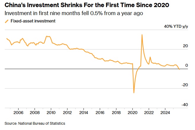 彭博社称,投资罕见下降,凸显普遍存在的经济疲软情绪。投资萎缩主要受房地产行业低迷的影响,基础设施和制造业的资本支出也出现放缓。
