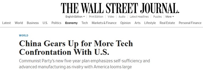 《华尔街日报》称,该蓝图表明,北京和华盛顿之间的竞争只会升级,中国希望进一步减少对美国的依赖,同时推进自身的技术雄心。
