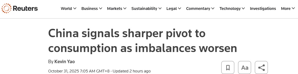中国经济重大信号!路透:随着失衡恶化 中国示意将更大力度转向消费