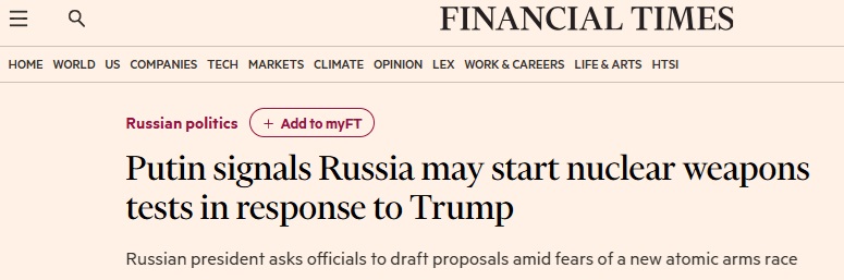 俄罗斯释放重要信号!金融时报:普京暗示俄可能启动核武器试验以回应特朗普