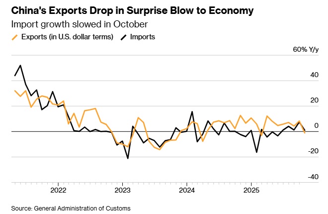 FX168财经报社(亚太)讯 美国彭博社周五(11月7日)最新报道称,10月份中国出口意外萎缩,当时正值中美关系再度紧张之际,这无疑给本已面临年末经济放缓风险的中国经济雪上加霜。