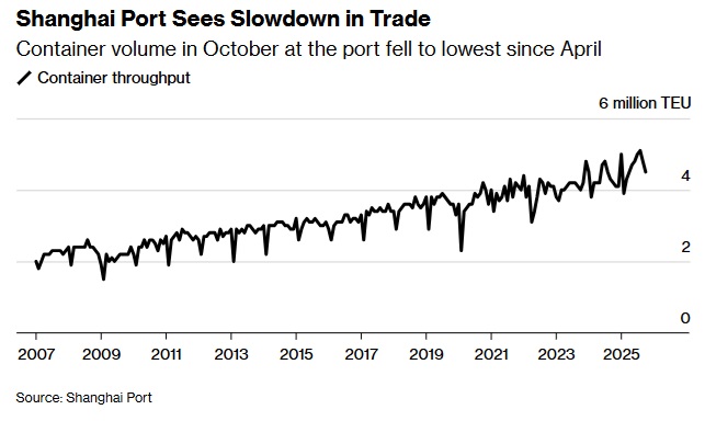 其他中国贸易指标在10月份开始从此前几个月的创纪录水平降温,上海港处理的集装箱数量降至4月以来的最低水平。这意味着出口企业发货量减少。