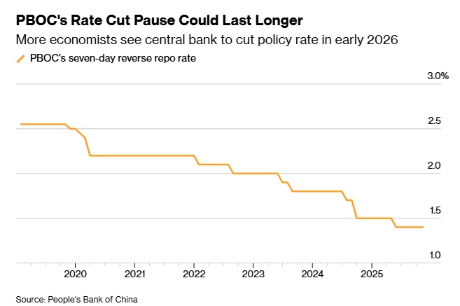 事实上,即便在本周中国央行报告发布之前,花旗集团(Citigroup Inc.)和彭博经济研究部门也已调整预期,认为2025年不会再有进一步的降息举措。
