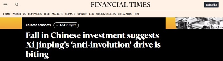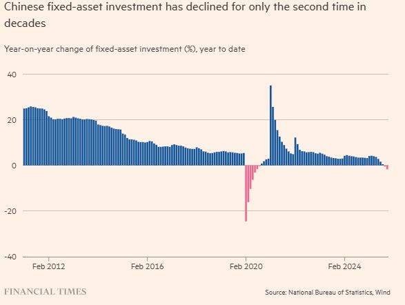固定资产投资的意外下降令人吃惊——这只是数十年来第二次出现此类收缩——此前习近平曾多次就高科技、绿色能源等行业的价格战发出警告。北京方面称作“内卷”的价格战,被广泛认为与产能过剩相关。