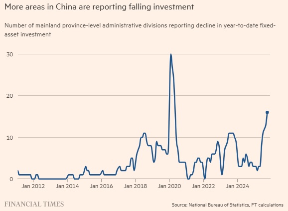 《金融时报》对区域FAI数据的分析也显示,中国大陆31个省级行政区中,超过三分之一的省级行政区FAI出现下降,而就在5月份,这一数字仅为3个。