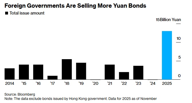 对北京而言,俄罗斯首次发行人民币债券将进一步推高这一规模:彭博汇编数据显示,今年包括匈牙利、印尼以及阿联酋沙迦在内的外国政府已累计筹集创纪录的130亿元人民币资金。