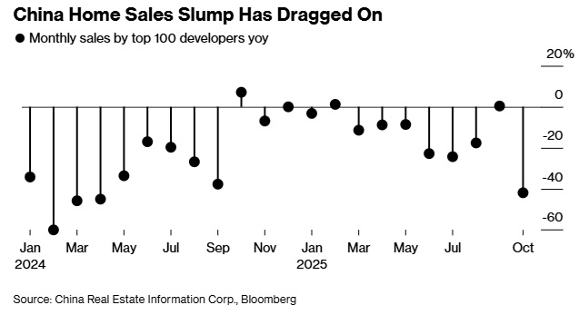 彭博社计算显示,10月份,中国房地产信息集团的数据显示,全国百强房企的新房销售额同比下滑41.9%,为18个月以来的最大单月跌幅。