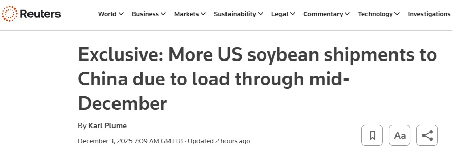 FX168财经报社(亚太)讯 英国路透社周三(12月3日)发布独家报道称,在一场紧张的关税战令贸易停滞数月之后,美国农作物对华出口正在加速。