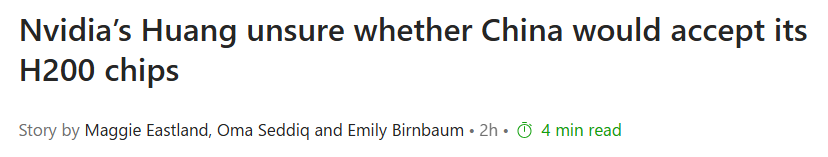 今年夏天,英伟达获准向中国销售性能削弱的 H20 芯片,但中国方面迅速告知潜在客户应避免采购该产品,转而使用国产处理器。英伟达随后试图寻求出口“弱化版 Blackwell”架构芯片的许可,但今年10月特朗普与习近平会晤期间并未取得结果。