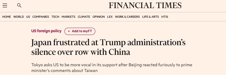 据现任及前任美日官员称,在中国就高市早苗表示“若中国大陆攻击台湾,将构成‘生存性的威胁’,足以促使日本动用自卫队”而对其猛烈抨击后,东京认为美国高层官员对日本的支持表态不够。