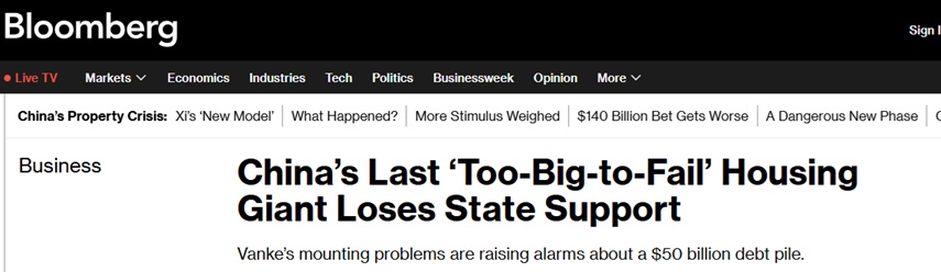 FX168财经报社(亚太)讯 美国彭博社周五(12月12日)发布独家报道称,中国最后一家“大到不能倒”的房地产巨头——万科失去了国家支持。万科日益加剧的问题正引发对其高达500亿美元债务规模的担忧。