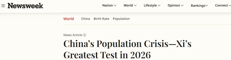 文章认为,中国的人口危机将是习近平在2026年面临的最大考验。