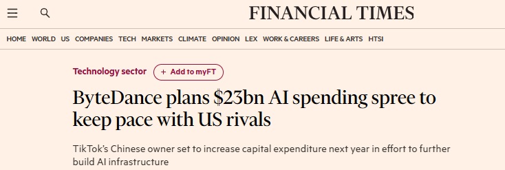 中国突发重磅消息!英国金融时报独家:字节跳动计划斥资230亿美元用于AI领域