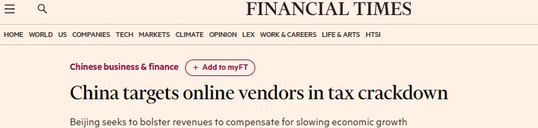 FX168财经报社(亚太)讯 英国《金融时报》周一(1月5日)报道称,中国当局正从线上商家征收到更多税款,这是一次整治行动的一部分。该行动源于北京希望增加财政收入,以弥补经济增长放缓带来的收入缺口。