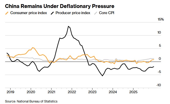 FX168财经报社(亚太)讯 美国彭博社周五(1月9日)最新报道称,中国通胀上月以近三年来最快的速度加速回升,主要受食品成本上升推动。这一反弹在一定程度上掩盖了更深层的通缩压力。