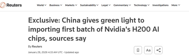 FX168财经报社(亚太)讯 英国路透社周三(1月28日)发布独家报道称,据两名知情人士向路透社透露,中国已批准进口首批英伟达(Nvidia)H200人工智能(AI)芯片,这标志着中国在权衡AI需求与推动本土产业发展之间,立场出现了转变。