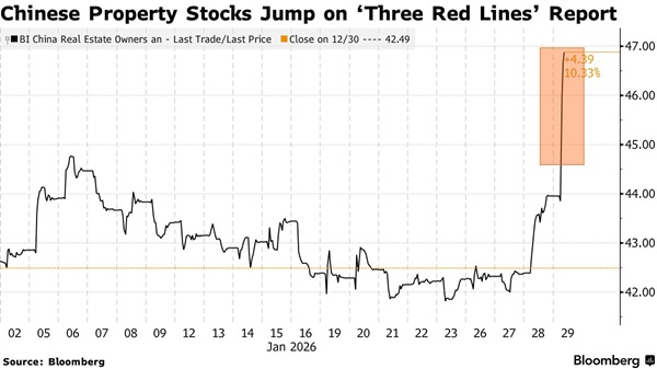 FX168财经报社(亚太)讯 美国彭博社周四(1月29日)最新报道称,在国内媒体报道开发商不再被监管机构要求提交一组旨在遏制其债务累积的关键指标后,中国房地产股票大幅上涨。
