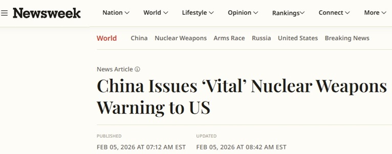 FX168财经报社(亚太)讯 美国《新闻周刊》当地时间周四(2月5日)报道称,中国敦促美国与俄罗斯迅速合作,寻求解决方案,以管理双方的核武库,因为《新削减战略武器条约》(New START)已到期。