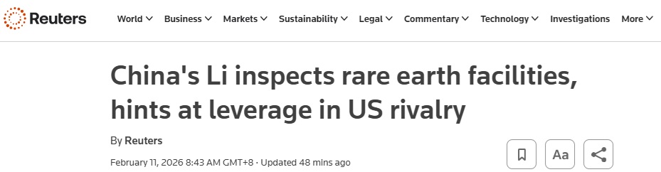 FX168财经报社(亚太)讯 英国路透社周三(2月11日)最新报道称,中国排名第二的领导人、国务院总理李强周二在南方江西省视察稀土设施,并借此行释放出在战略性矿产领域与美国竞争加剧的信号。