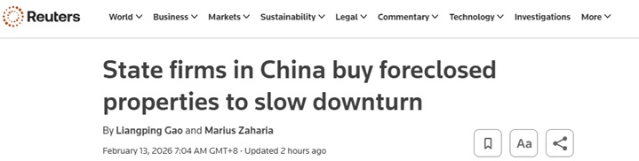 FX168财经报社(亚太)讯 英国路透社周五(2月13日)最新报道称,中国国有企业正在收购被止赎的房地产项目,这表明政府长期承诺、旨在化解受危机重创的住房行业“巨大过剩供给”的努力,终于开始取得进展——尽管推进速度仍然缓慢。